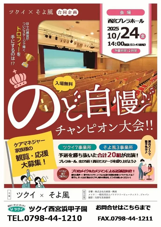 ツクイ×そよ風 合同企画 のど自慢 チャンピョン大会 祭り・イベント 2025.10.13イベント詳細日付: 2025年10月24日 14:00 – 16:00会場: 西宮市プレラホールカテゴリ: 祭り・イベントツクイ×そよ風 合同企画 のど自慢 チャンピョン大会【開催日時】 10月24日(金)14時 開演【開催場所】 西宮市プレラホール【チケット】 入場無料 要整理券【問い合わせ】 ツクイ西宮浜甲子園 0798-44-1210