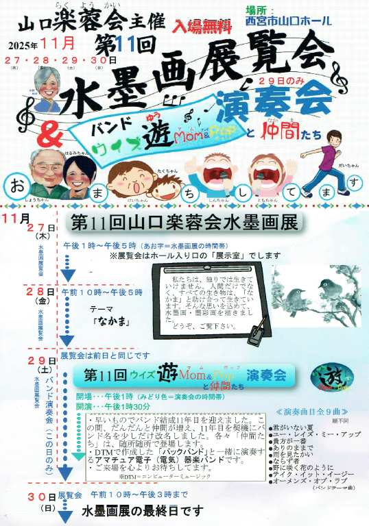 第11回山口楽蓉会水墨画展 展覧会・作品展 2025.10.19イベント詳細日付: 2025年11月27日 10:00 – 30日 17:00会場: 山口ホールカテゴリ: 展覧会・作品展第11回山口楽蓉会水墨画展私たちは、独りでは生 いけません。人間だけでなくすべての生き物は、「なかま」と助け合って生きてます。そんな思いを込めて、 水墨画・墨彩画を描きまし た。どうぞ、ご覧下さい。【開催日時】 11月27日(木)~30日(日) 10:00~17:00 *27日13:00~/30日は15:00まで【開催場所】 西宮市山口ホール ホワイエ[展示室] (西宮市山口町下山口4-1-8山口センター内1階)*入場無料【主催】 ウィズ遊Mom&Popと仲間たち